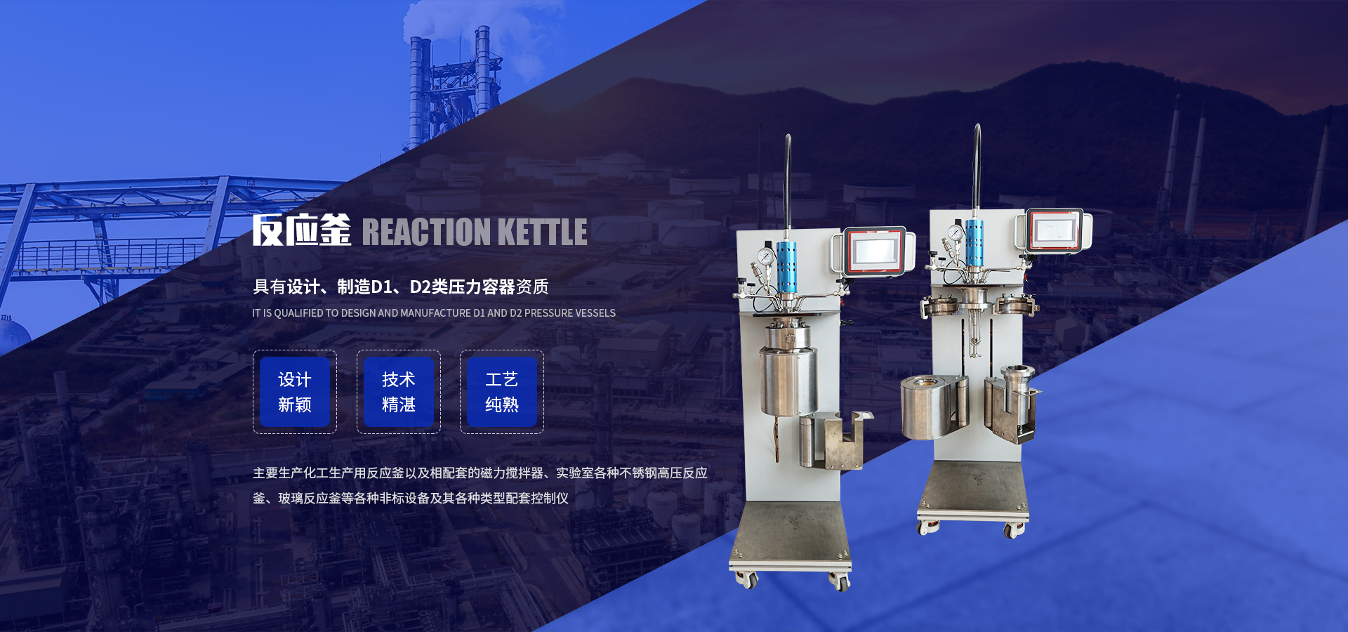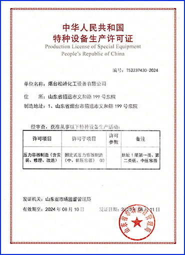 松嶺化工專一化工裝備行業15年,集科研、開辟、設想、 出產于一體的高新手藝企業,還具備設想、制作D1、D2類壓力容器天資。